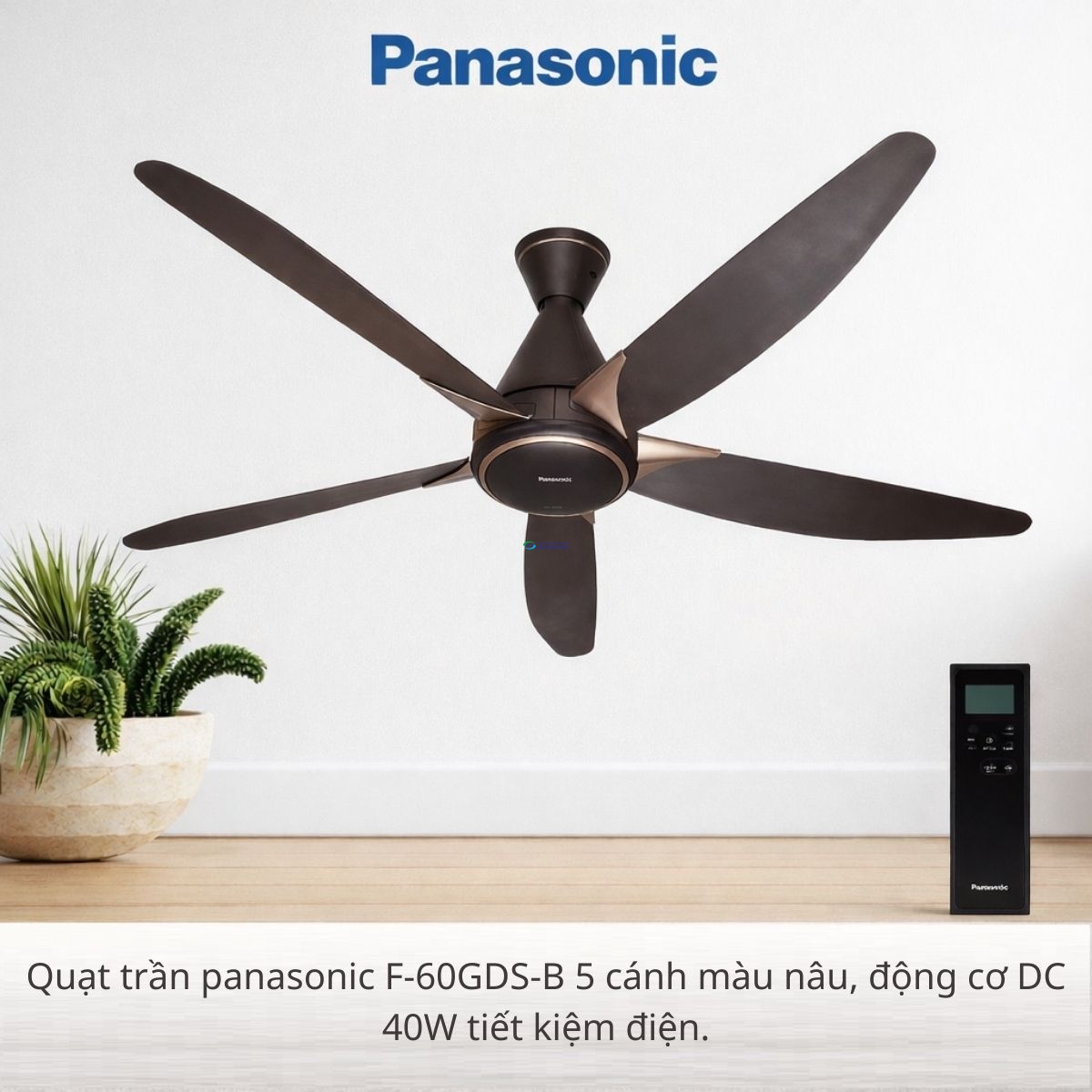 Quạt trần Panasonic 5 cánh màu nâu F-60GDS-B là mẫu quạt trần cao cấp được nhiều gia đình lựa chọn nhờ thiết kế sang trọng, khả năng làm mát hiệu quả và động cơ DC tiết kiệm điện. Không chỉ đóng vai trò làm mát, sản phẩm còn giúp tăng tính thẩm mỹ cho không gian nội thất hiện đại.
